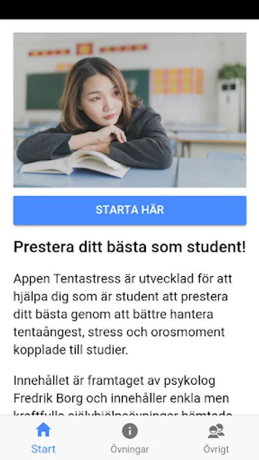 The content is produced by psychologist Fredrik Borg and contains simple but powerful self-help exercises from KBT and ACT as well as tips and tricks for the study period. Minor modifications to the exercises have been made to fit in with the student context.