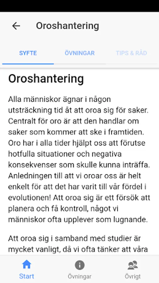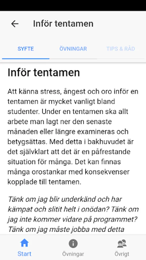 The app is for those who experience moderate stress and anxiety associated with studies. The app should not be seen as a substitute for psychological treatment. If you experience a lot of anxiety, stress or anxiety, we instead recommend that you contact the student health or health center to meet a personal contact.