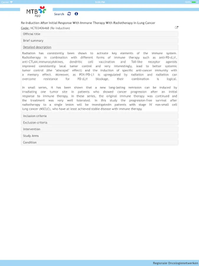After entering the mutations and / or other tumor characteristics you get a complete overview of ongoing cancer studies that could fit the patient. You can then find out more about each of the studies, as the main inclusion and exclusion criteria, intervention, objectives and research design.
