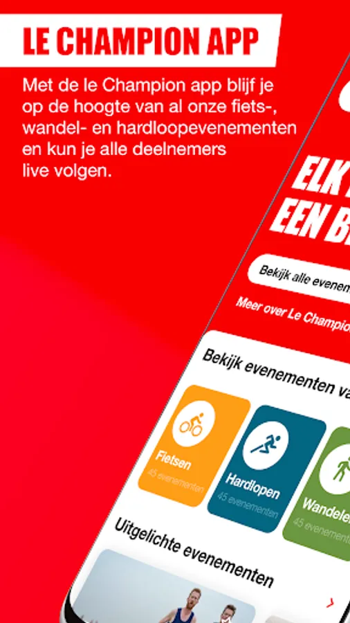 In this Le Champion app, participants and supporters can enjoy the ultimate sports experience before, during and after the events of Le Champion. From LiveTracking to important event information and training tips. The useful functionalities ensure an even more enjoyable participation and perfect preparation.