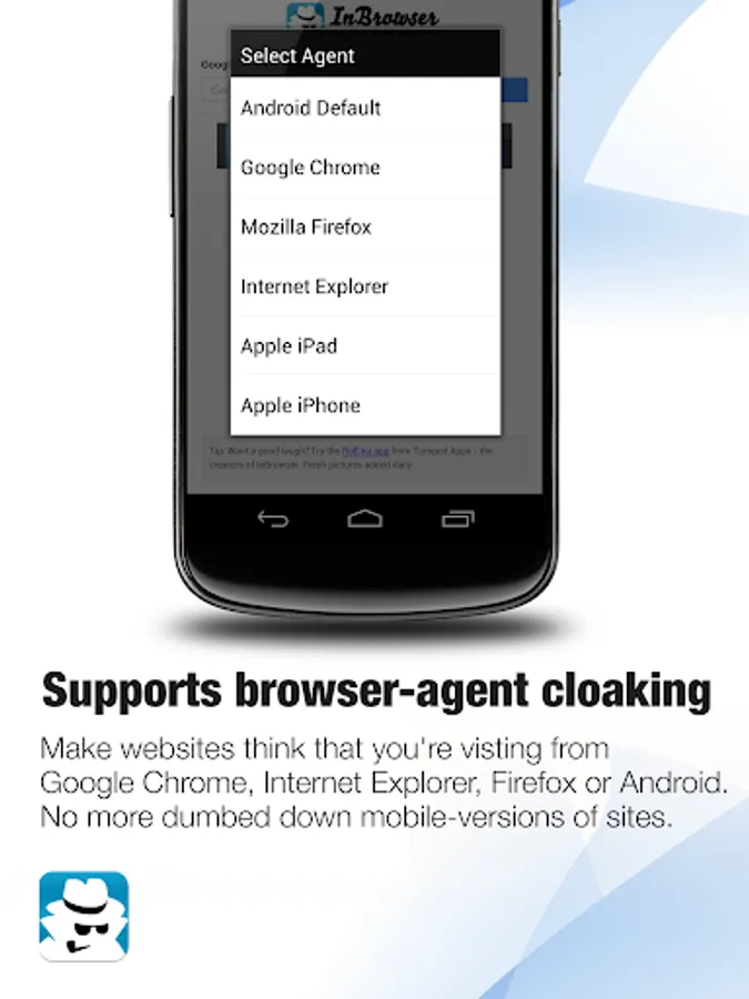 Make websites think that you're visiting from Google Chrome, Internet Explorer, Firefox, or Android.