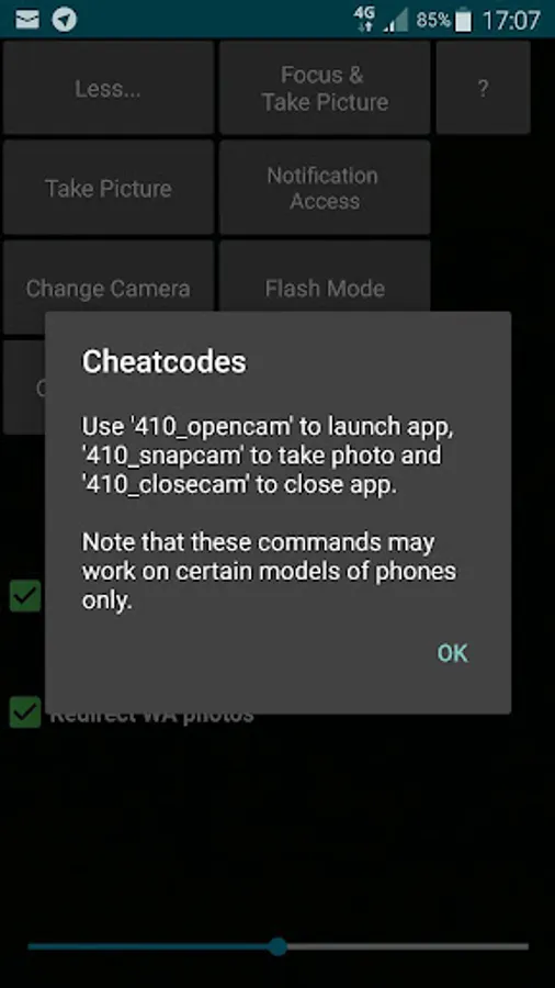 12. Press '?' button. A message box will popup listing a series of cheat codes. Memorize or write down the codes somewhere. The codes are like “XXX_opencam”, “XXX_snapcam” and “XXX_closecam” which 'XXX' represents the passcode generated specifically for your phone.