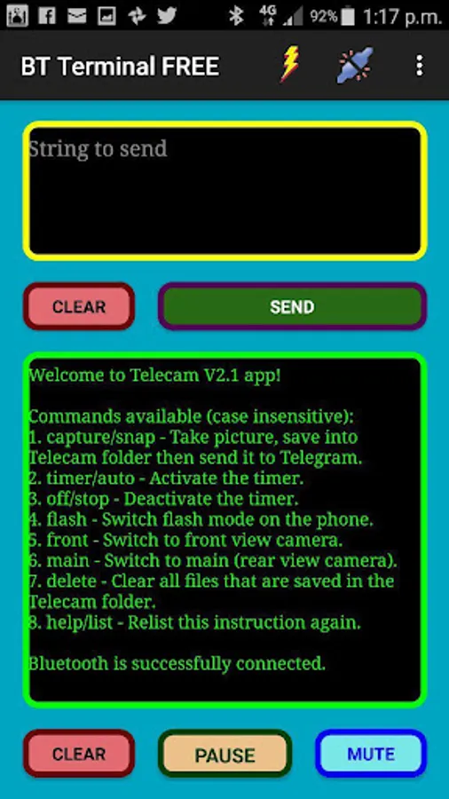 5. Follow the instruction from the welcome text shown on the screen. Send Capture, Flash, Front, Main, Timer, Stop and Help sequentially and see what happens (all commands are case insensitive).