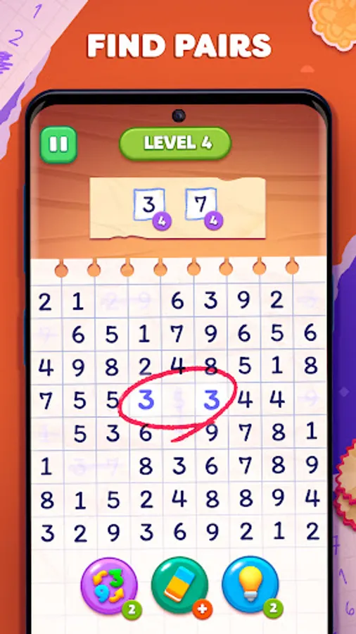 🌺 Find the pairs of the same numbers (3-3, 7-7) or those which add up to 10 (4-6, 2-8). Just tap the numbers to remove them from the playing field.