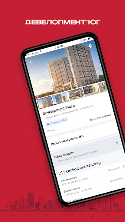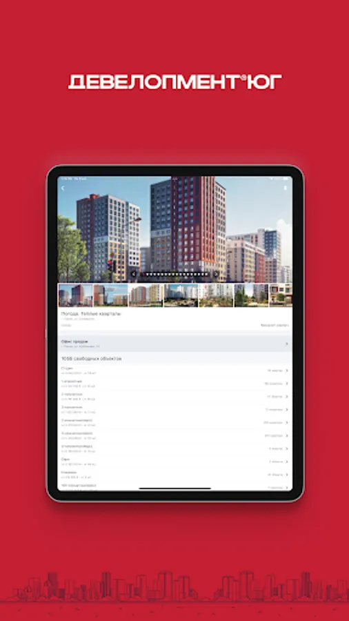 Dear partners, acquaint clients with the projects of the corporation, form special offers, register a client and receive remuneration. In the Development-South application there is always up-to-date information about residential complexes, stock balances and promotions.