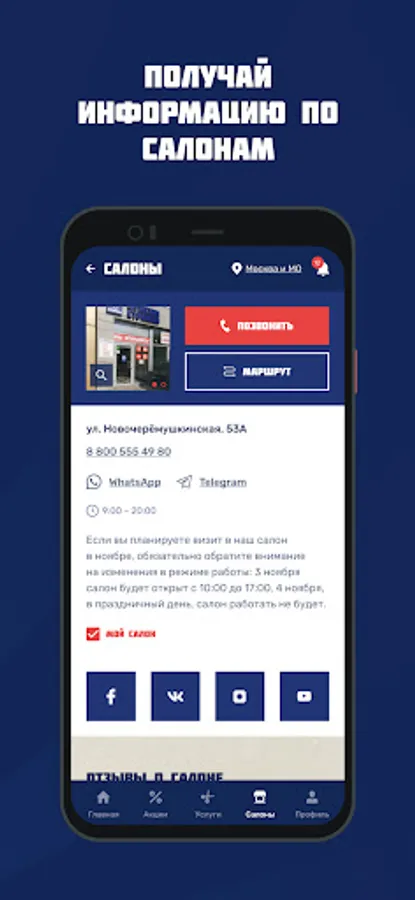 Get information about prices, find the nearest salons, participate in the bonus program and leave reviews right from the mobile application.