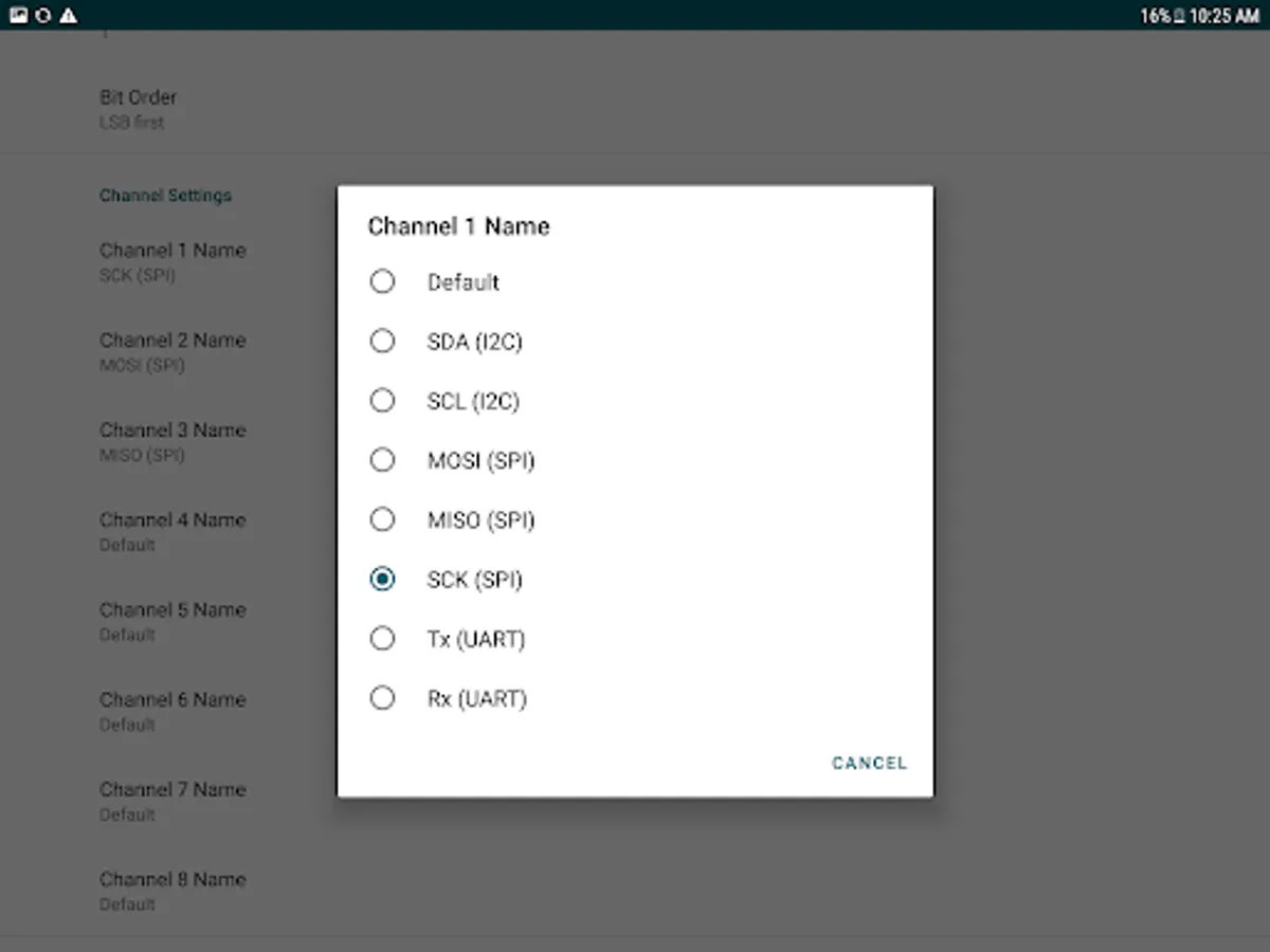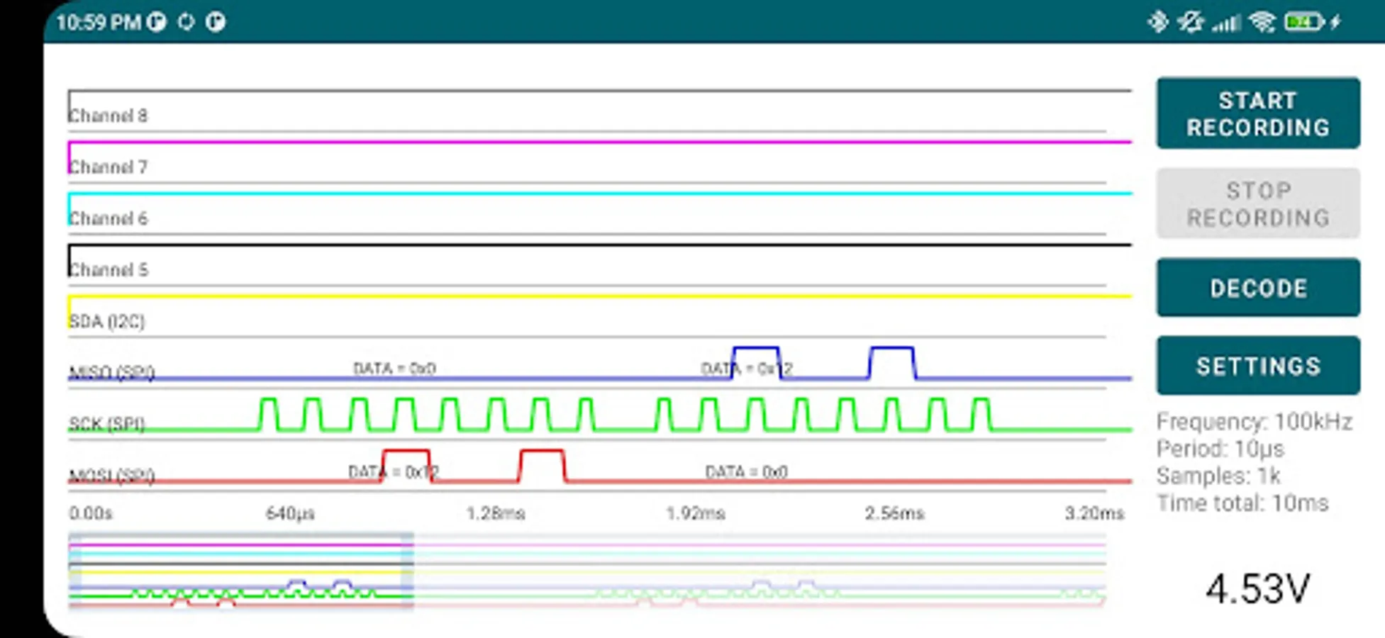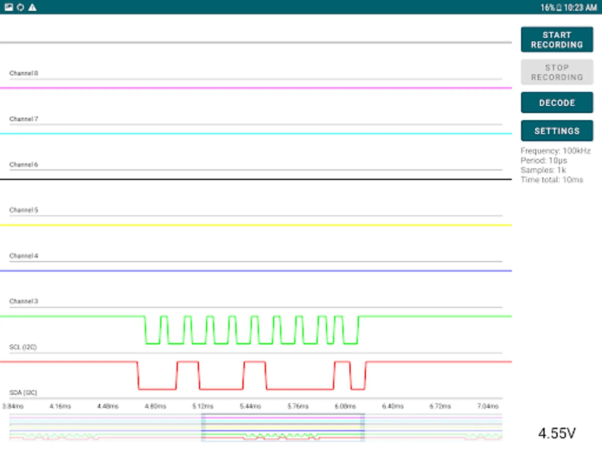 This application has been developed as part of the Android Logic Analyser project, as a final year capstone project for the BEngTexh course at Ara Institute of Canterbury. It receives data over USB from custom analyser hardware, controlled by a ARM Cortex-M33 microcontroller. It is currently capable of receiving eight channels, at frequencies up to 120kHz. It can decode UART, I2C and SPI protocols. It displays eight waveforms and provides scrolling, zooming and measuring options.