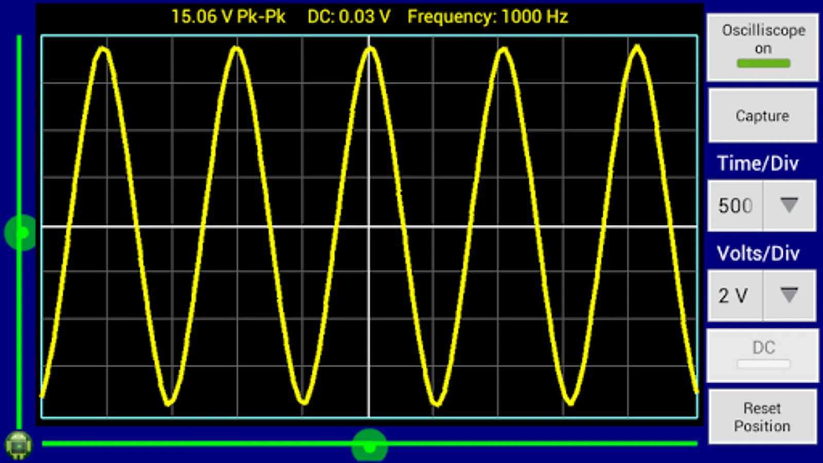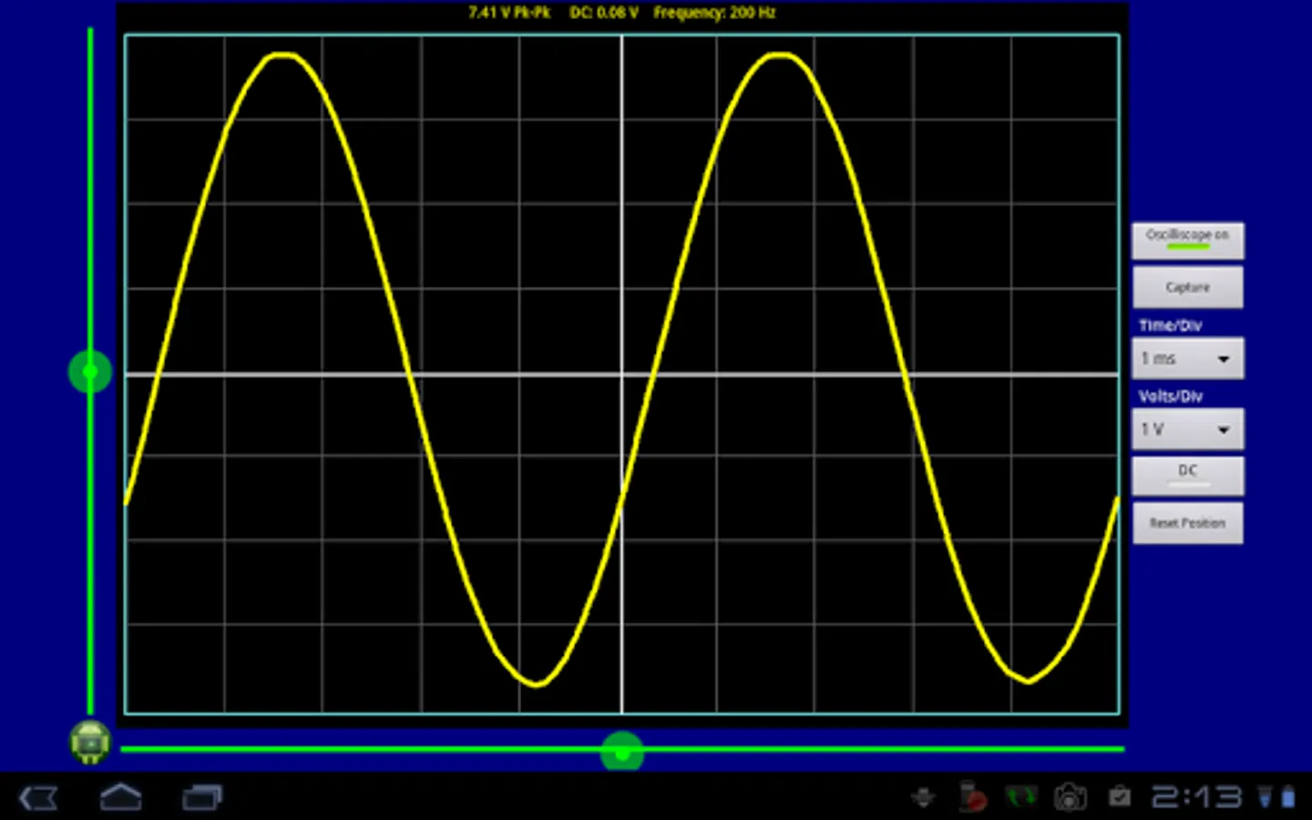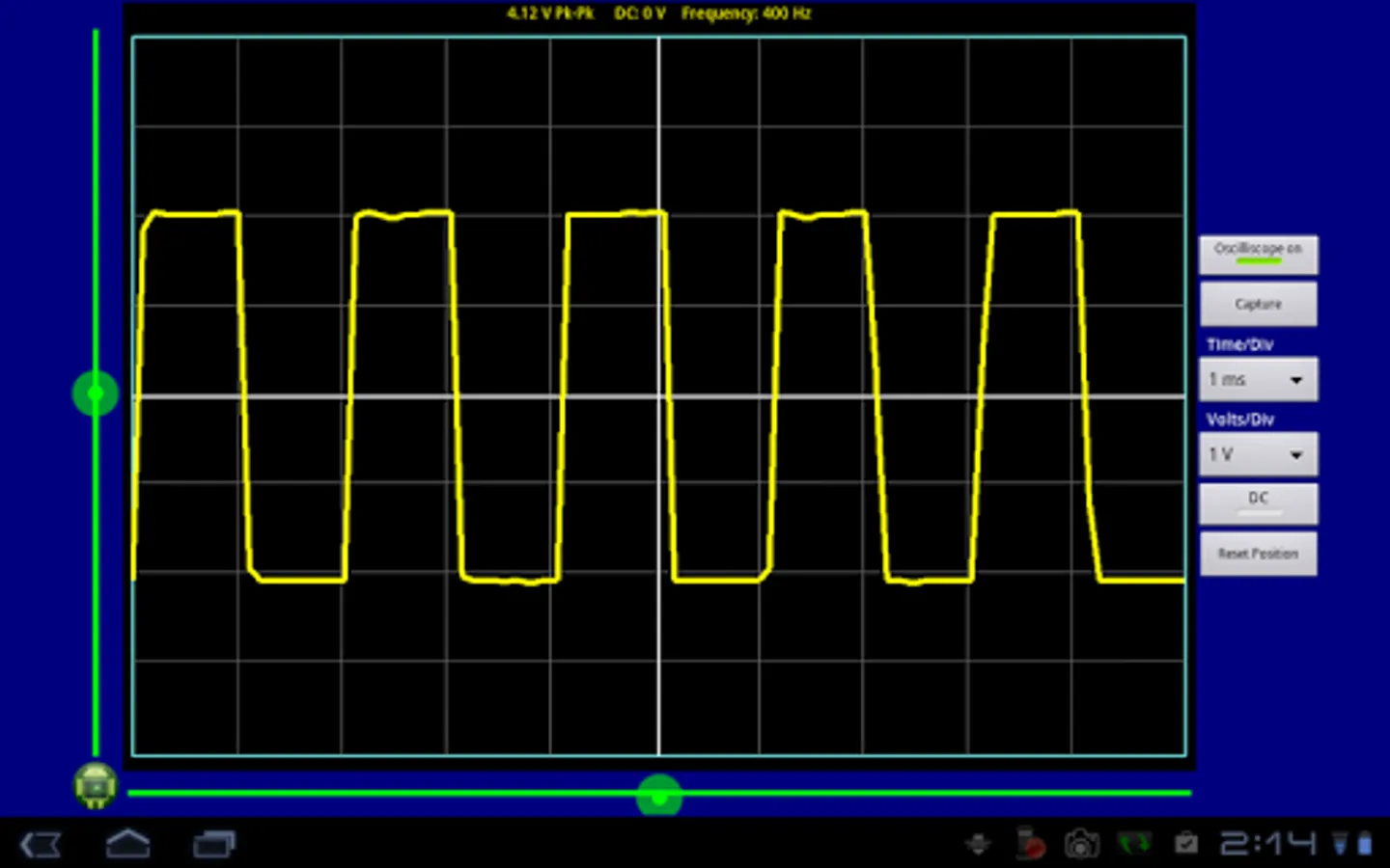 This application has been developed in conjunction with the Android Oscilloscope Peripheral. It is part of a final year project for CPIT’s BEngTech program. The Android device acts as the display and control of the oscilloscope, capable of selecting the V/Div and T/Div.