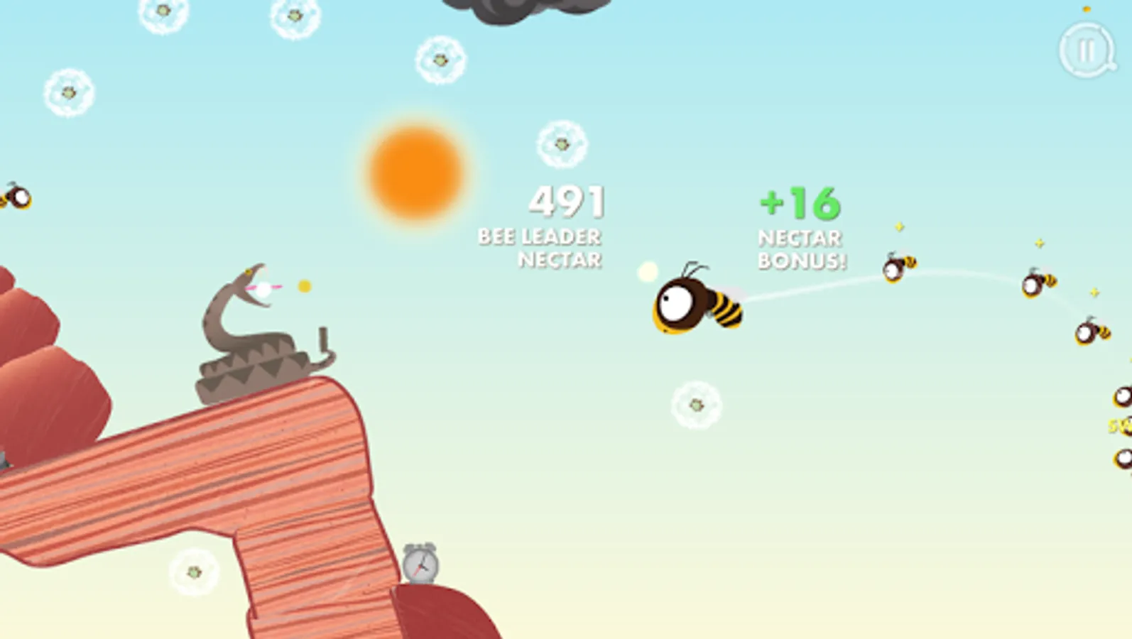Fly around the world and hover over flowers to collect nectar. Look out for enemies and bad weather! Collect as much nectar as you can before the sun sets. The faster you get nectar back to your hive the more honey you'll make! Pick up plenty of bonuses along the way - nectar, honey, time, and bee buddies. The more bee buddies you find, the more nectar you'll collect. More nectar means more honey - sweet!