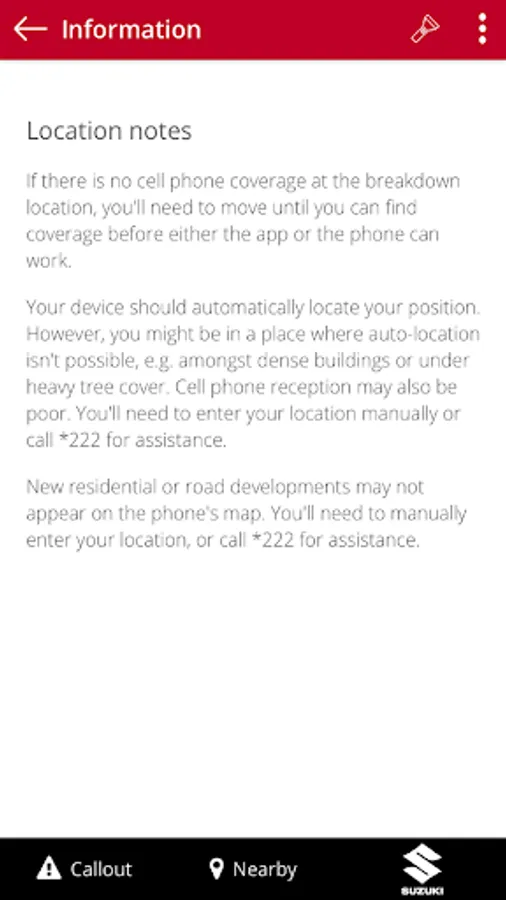 To use the Suzuki Roadside Assistance app you need to be in New Zealand and registered for the Suzuki Roadside Assistance Program.