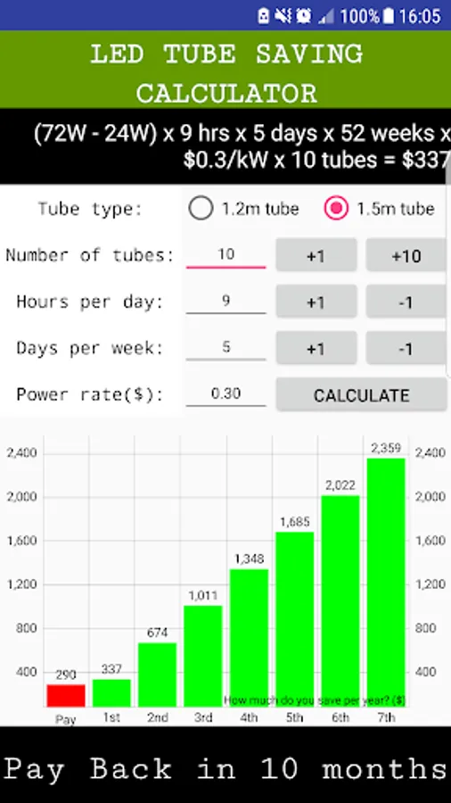 Not sure how much you are saving by switching to LED? Don't want to do hard calculations? Use this newly designed app to accurately work out how much you save on with LED! Set your number of LEDs and estimated usage time then you'll be on your way! Happy saving!