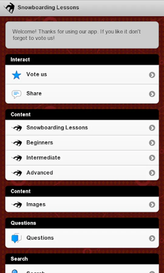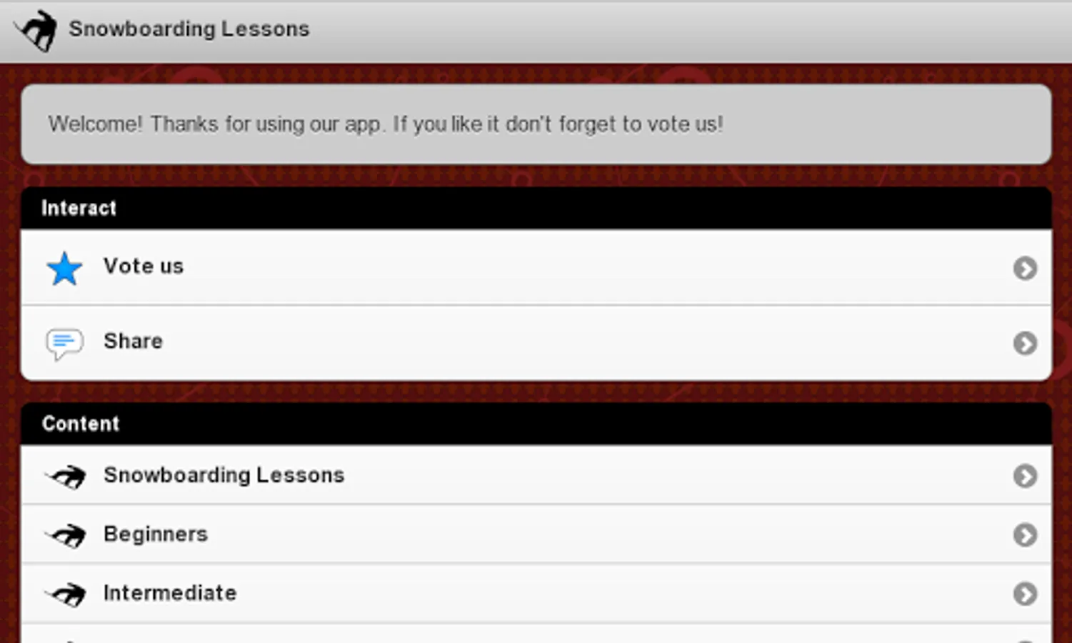 Are you a lover of winter sports? Would you like to learn how to snowboarding in an easy and entertaining way? Would you like to improve your technique and become a professional snowboarder? With the app "Snowboarding Lessons", you will learn everything you need to learn how to snowboarding and to improve your technique, with videos that will help you to correct your body position while you practice this sport. And all of this for free!
