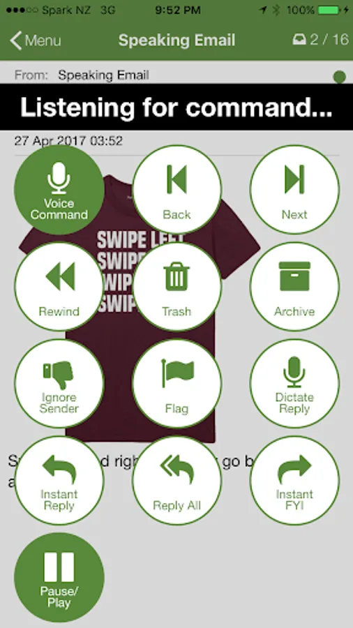 Free basic version. Upgrade to premium for only US$5 a month (approx, depending on currency). Premium includes multilingual, multiple accounts, reply dictation, forward, delete, attachment reading, filtering, folders, compose, and more.