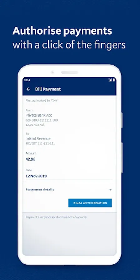 • Authorise same-day cleared payments, international payments and transfers, direct credit, direct debit, payroll and tax payments