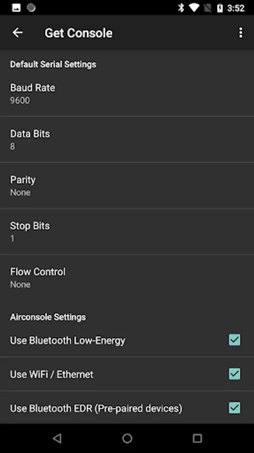 Get Console for Android is the VT100 terminal app that provides physical serial console access to network and other equipment via the Airconsole range of Serial adaptors (WIFI, Bluetooth and Bluetooth LE). Includes full Logging, integration with Dropbox, and instant Screen Sharing via the Airconsole Enterprise Server. Please read below for Full information.