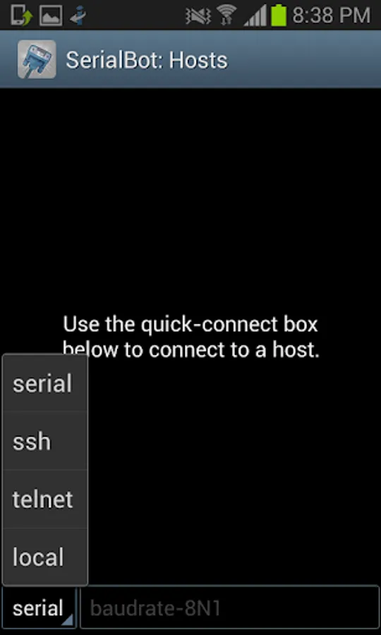 SerialBot is a Telnet/SSH client with integrated support for RS232 Serial connections via Wifi-to-Serial or Bluetooth-to-Serial adaptors such as Airconsole. Use SerialBot to connect to serial ports such as router console ports, industrial equipment and other devices that have RS232 connections from your Android device.