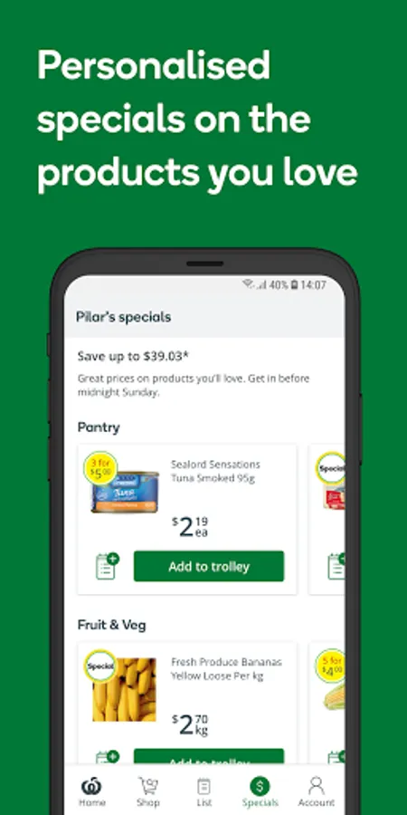 Browse the products you love on special and add them straight to your shopping list or trolley.