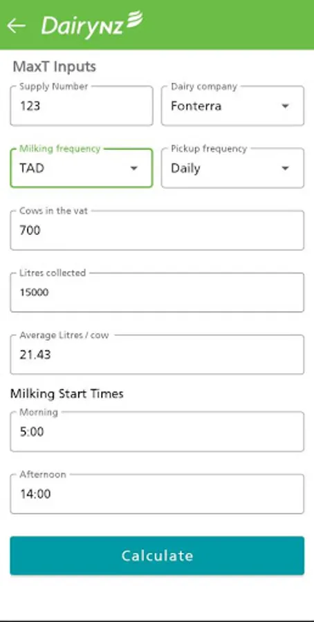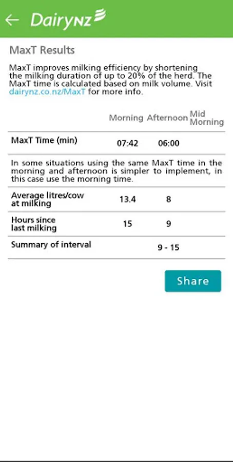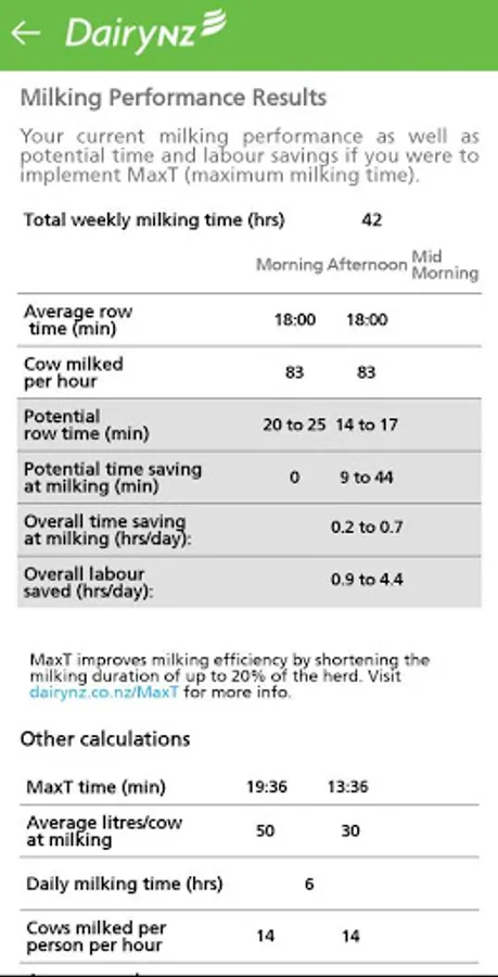 The Milksmart app also calculates your MaxT (maximum milking time) so you can implement milking routines based on time. MaxT results are for both rotary and herringbone dairy types.