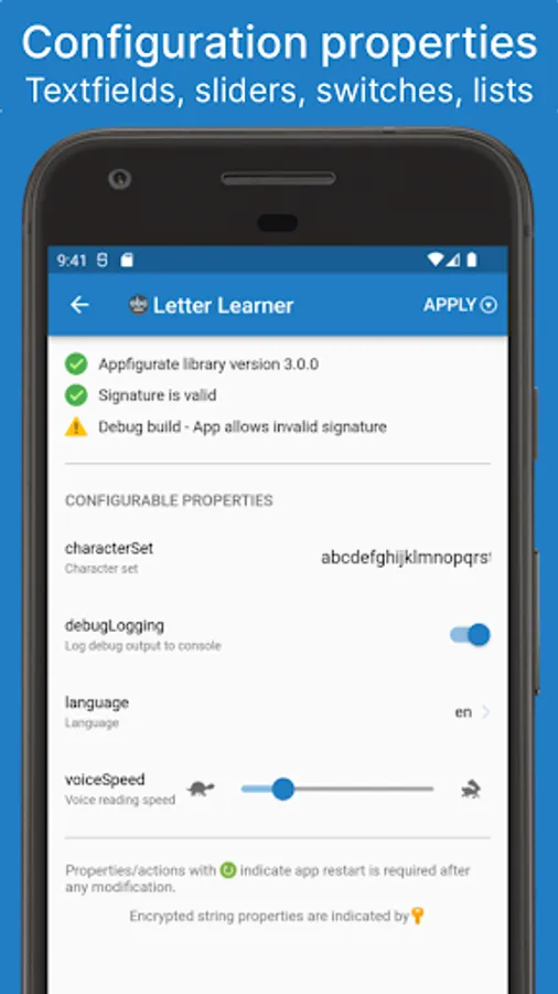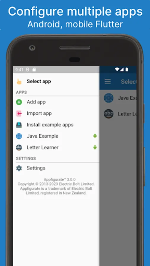Appfigurate is a platform that allows you to change local configuration properties in Android and mobile Flutter apps, securely, at runtime.
