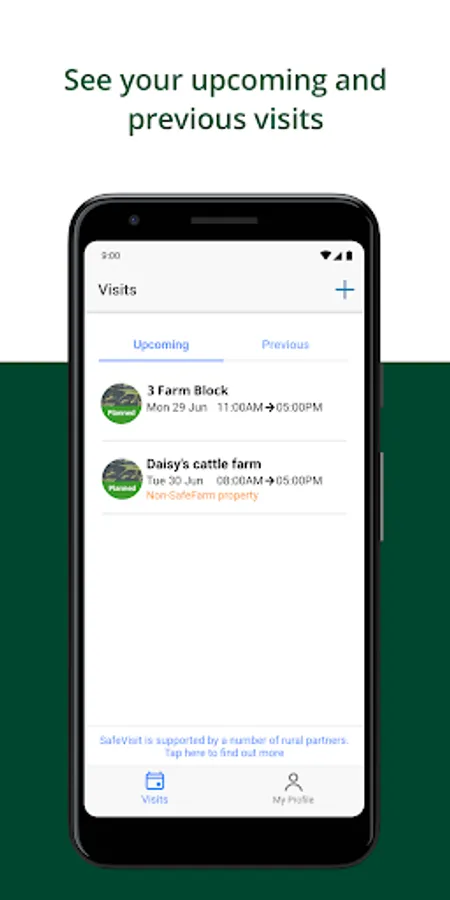 The SafeVisit mobile app helps farmers and growers manage their Health and Safety obligations when they have visitors on-farm. Working in conjunction with the SafeFarm mobile app and web system, SafeVisit allows guests to request permission to enter property and provides the ability for farmers to supply all the necessary Health and Safety documentation required. This can include a site map, hazard register and the ability to contact somebody during their visit.