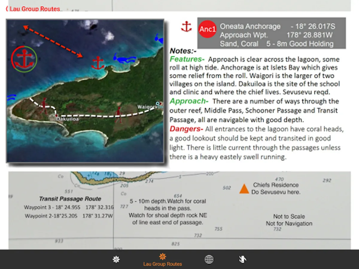 * Charts/Routes/Waypoints; Close-up Anchorage chartlets; Photos and local inside info for: Savusavu and approaches; Nakama Creek, Namena Reef, Koro Anchorages, Somosomo Strait, Viani to Rabi, Taveuni, Qamea and Vanua Balavu and the Southern Lau.