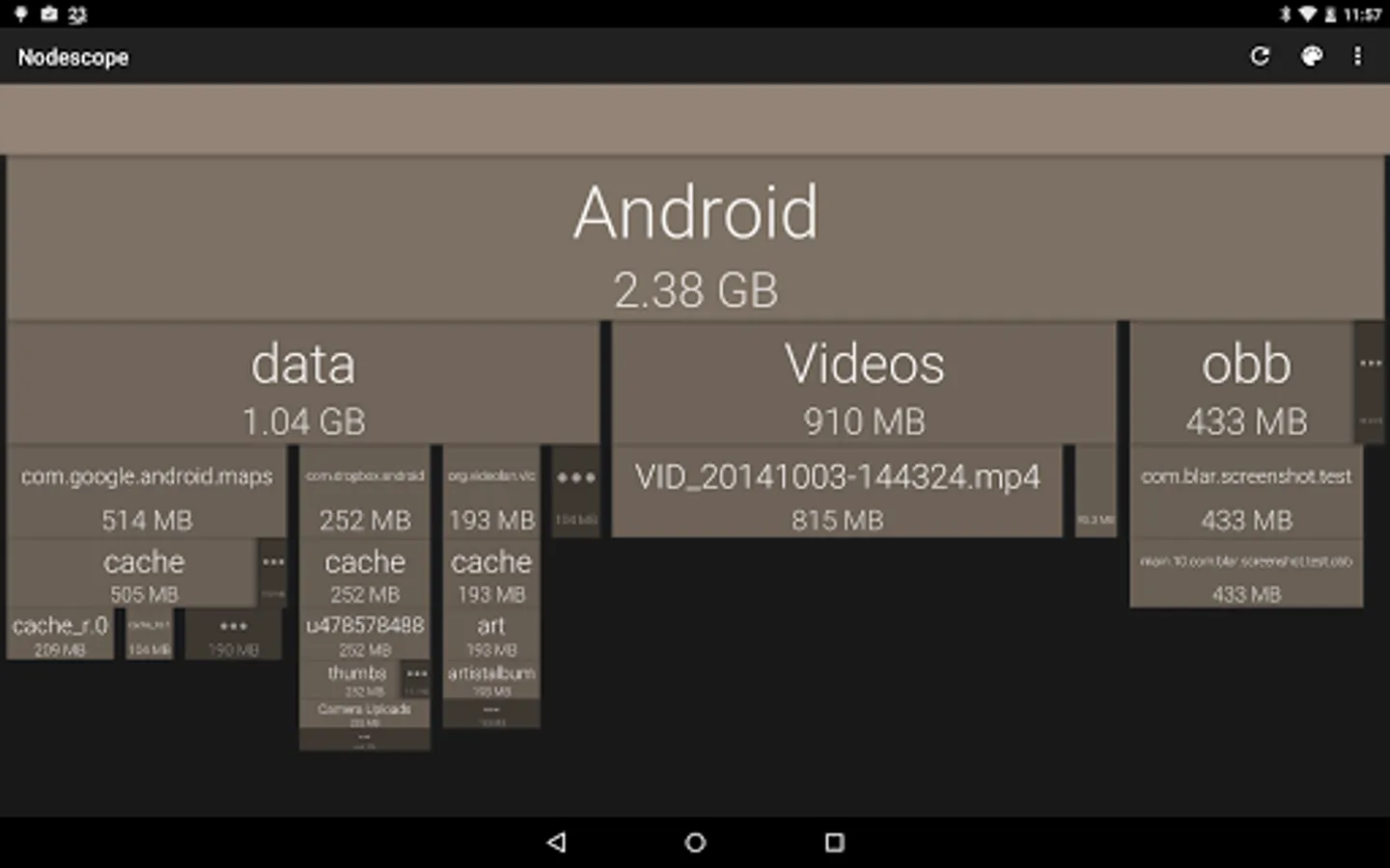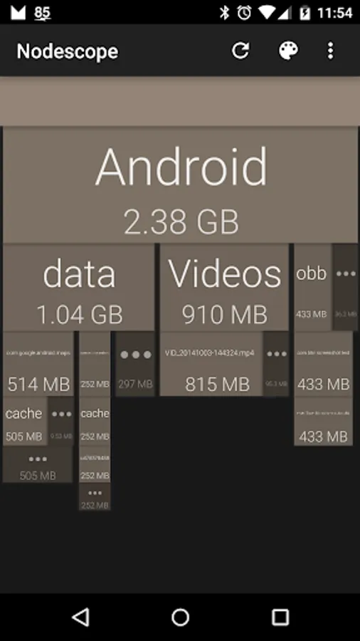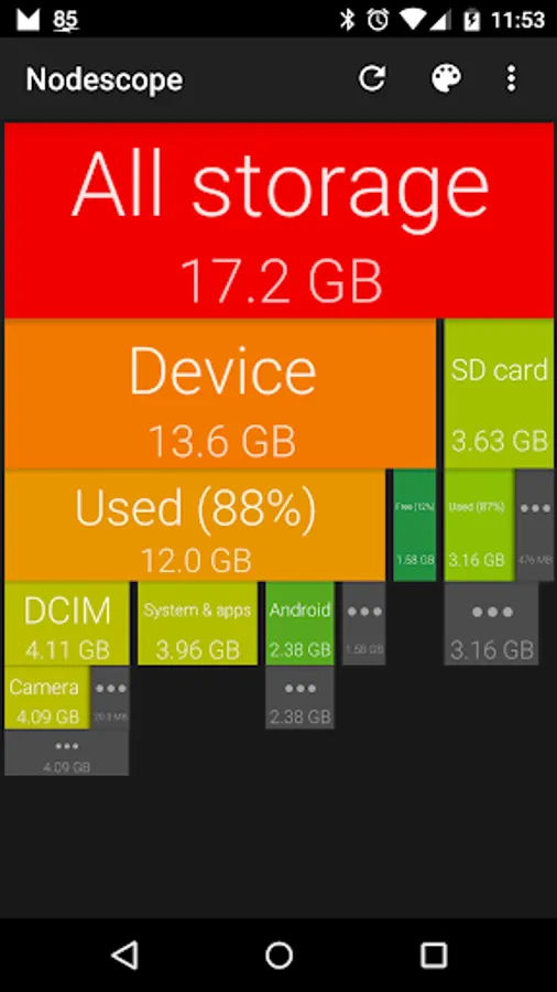 Nodescope shows a tree of boces representing your USB storage's folder structure, where each box's color and size represents the disk usage of that file or directory. The contents of each folder are shown underneath the box for that folder, so you can drill down into the hierarchy.