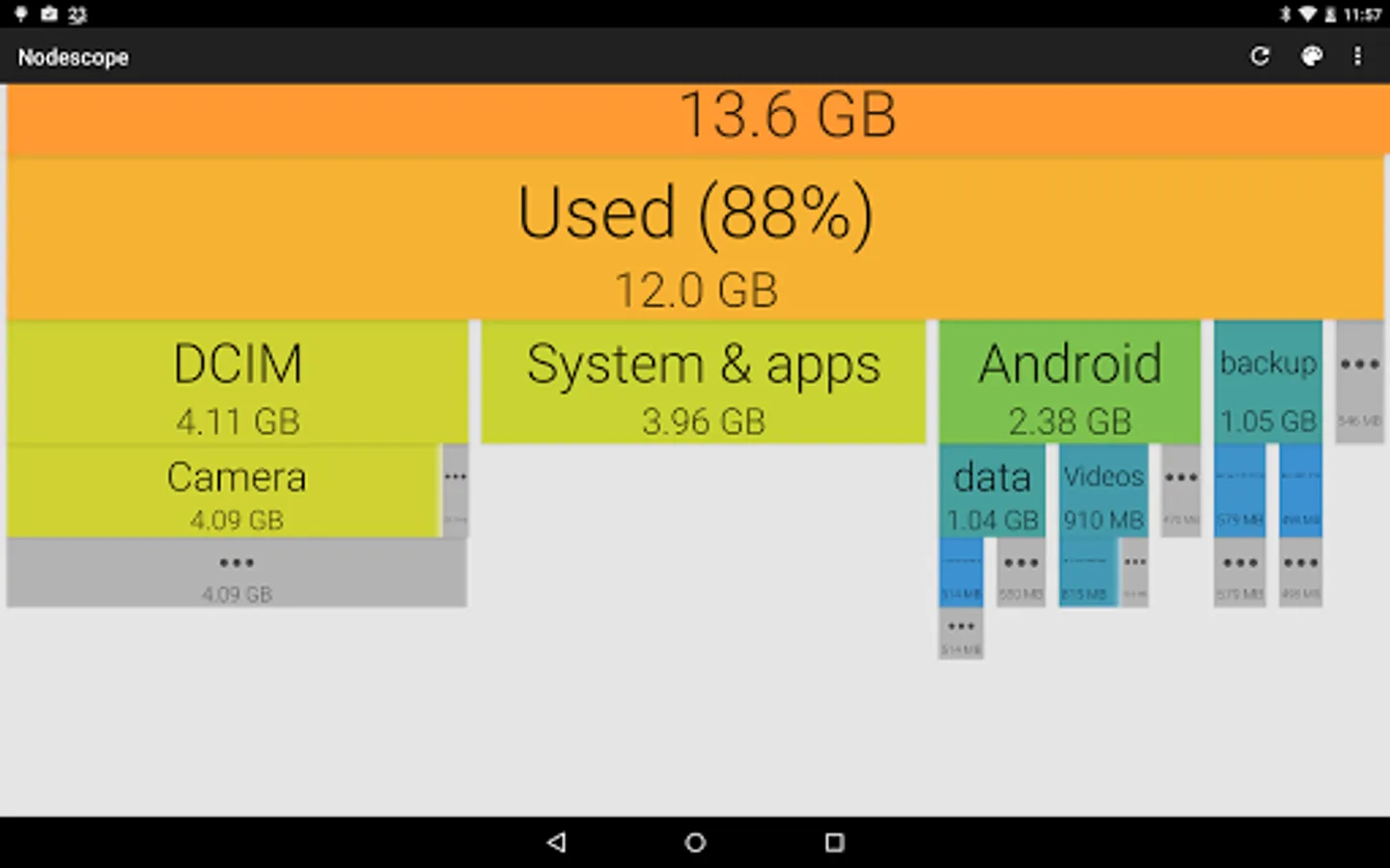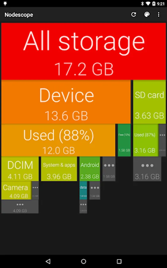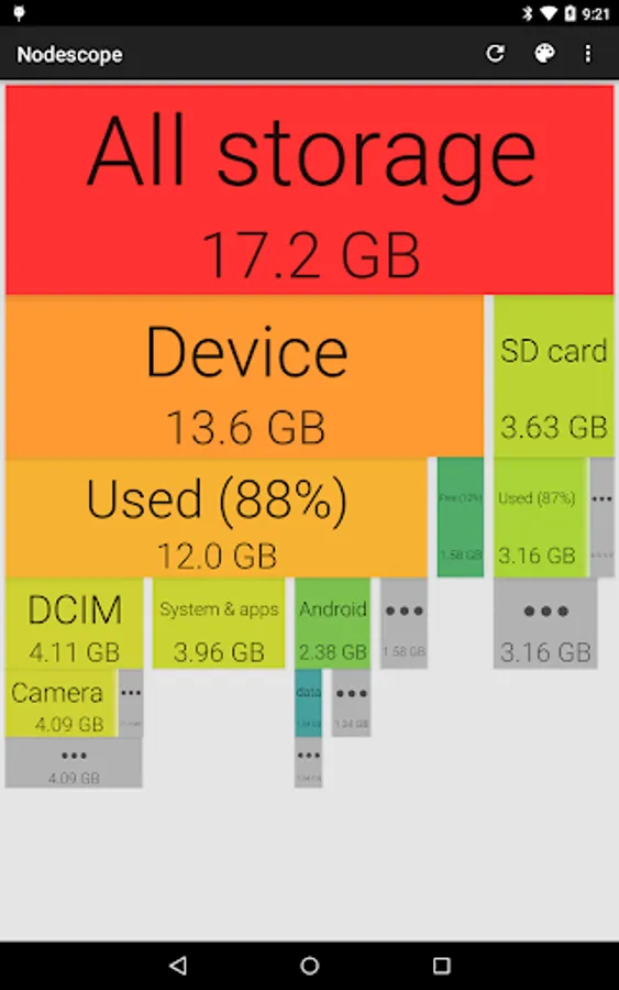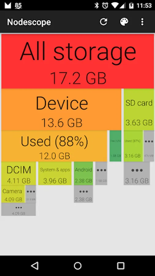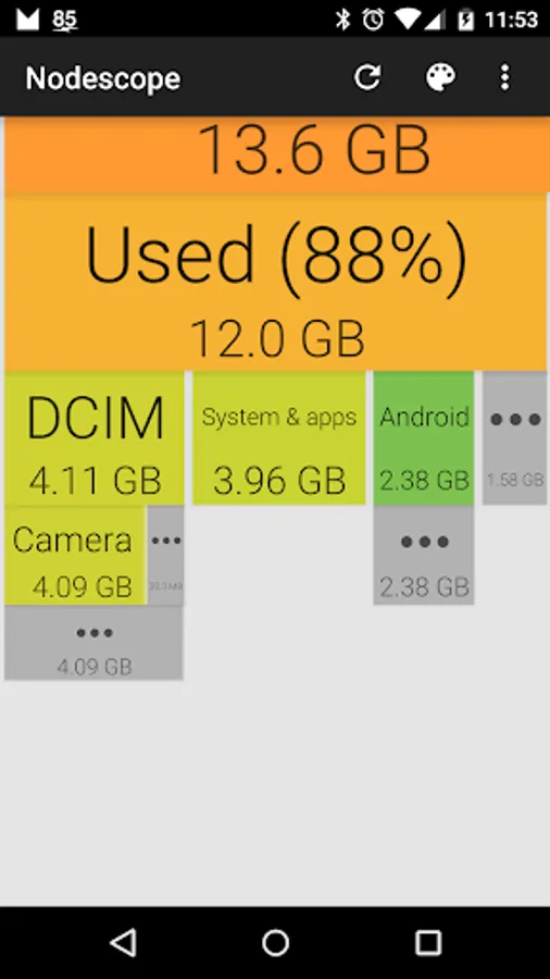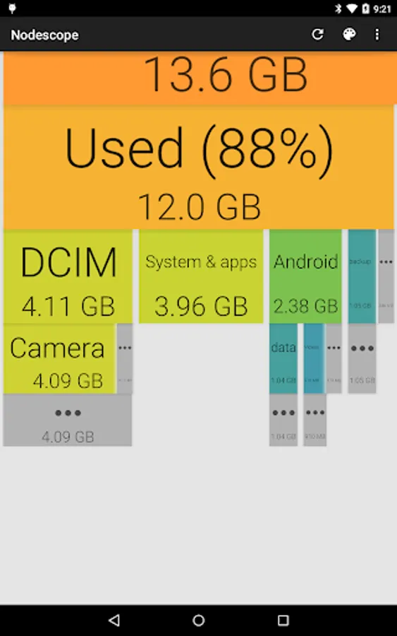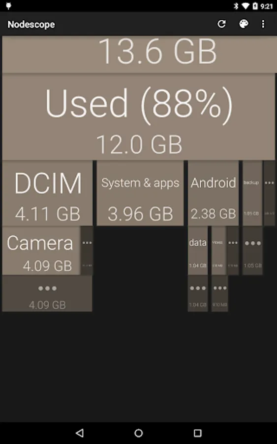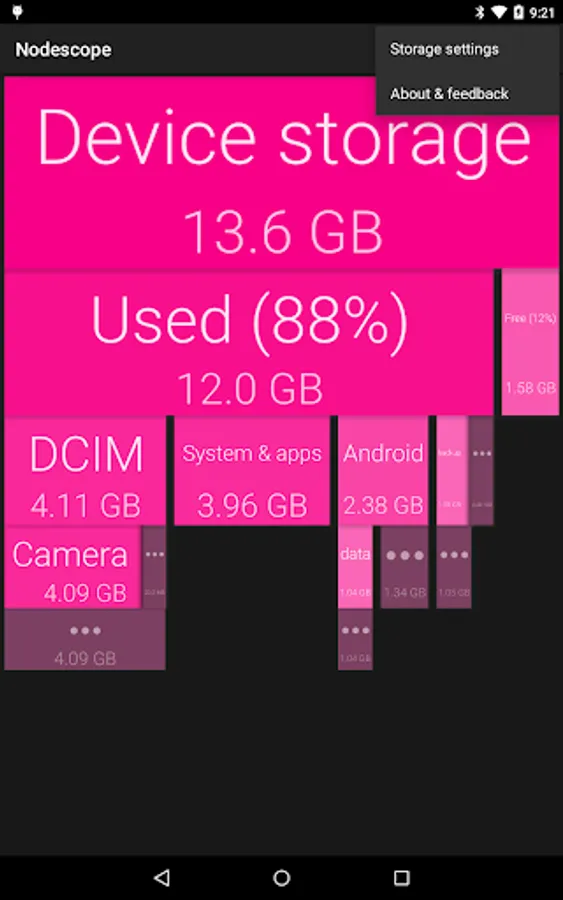Tap on a box to zoom to that box, or swipe and pinch to navigate around. The children of each folder are sorted biggest to smallest, left to right. Children that aren't big enough to show are grouped together into a grey box - zoom in or tap to see them.