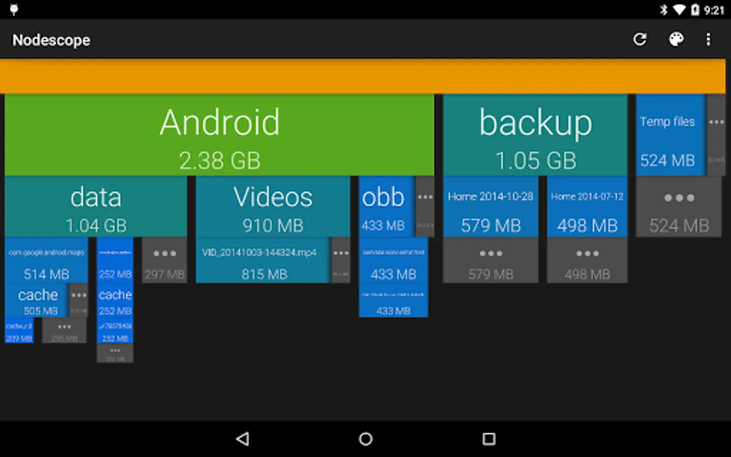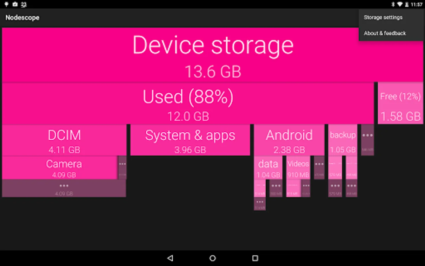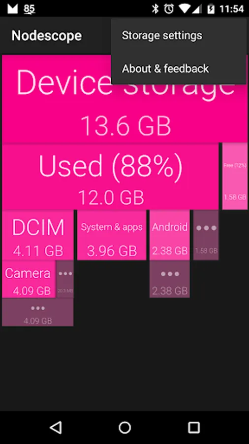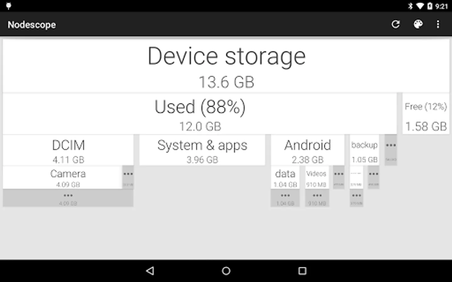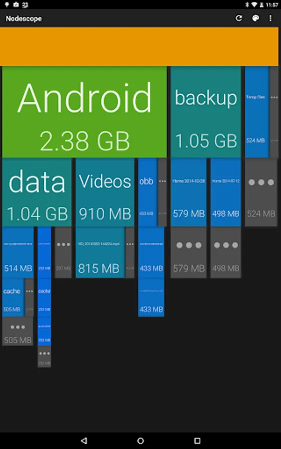 Tap on a box to zoom to that box, or swipe and pinch to navigate around. The children of each folder are sorted biggest to smallest, left to right. Children that aren't big enough to show are grouped together into a grey box - zoom in or tap to see them.
