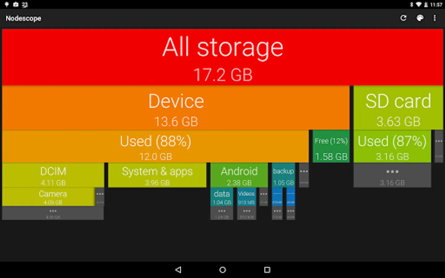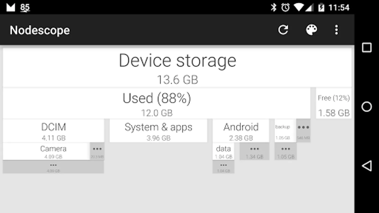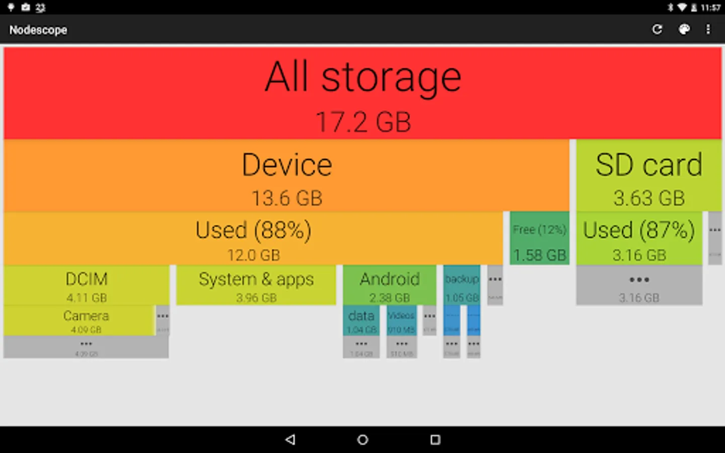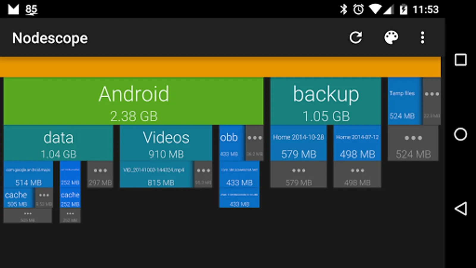 Tap on a box to zoom to that box, or swipe and pinch to navigate around. The children of each folder are sorted biggest to smallest, left to right. Children that aren't big enough to show are grouped together into a grey box - zoom in or tap to see them.
