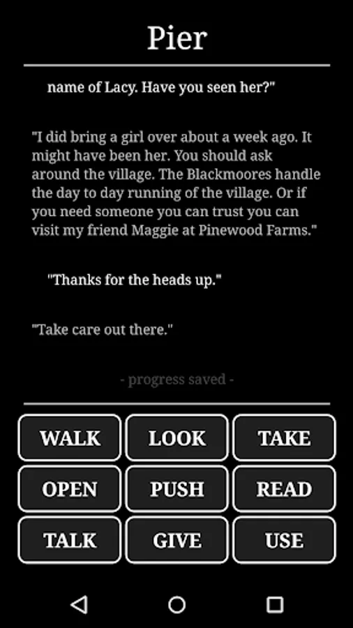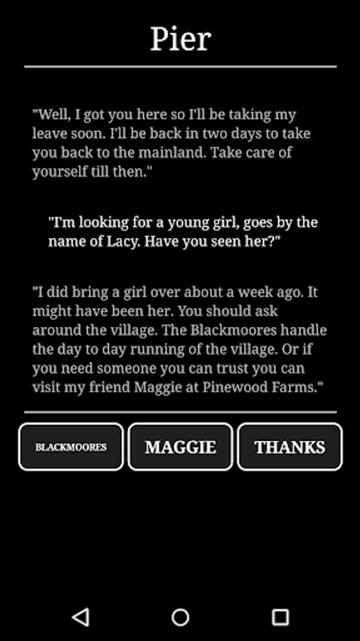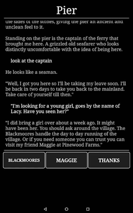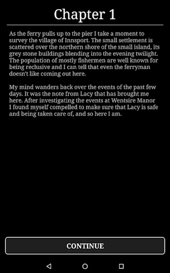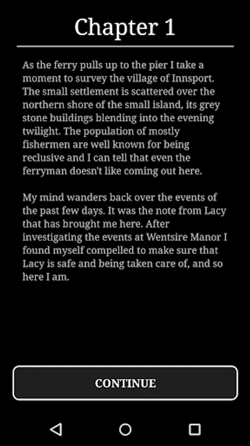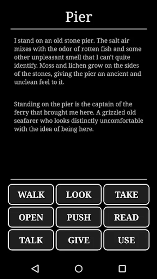 Horror at Innsport is an exploration adventure game inspired by Lovecraftian fiction, where players explore and investigate a large open world map, progressing though an engaging and exciting story. It is a mobile phone adaption of the classic text-based adventure genre, similar to the point-and-click classics. The game combines a bleak environment, an sense of underlying dread, and several action sequences with moments of comedy to keep you entertained.