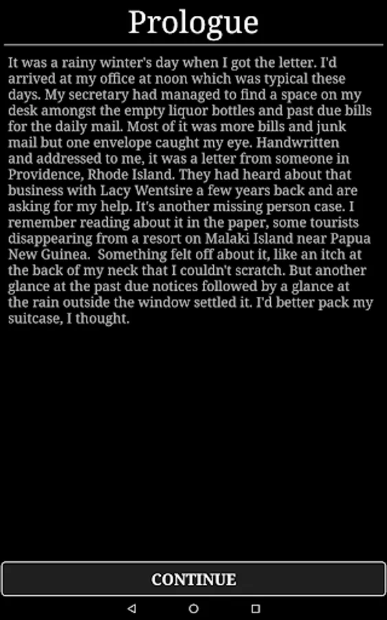 Horror in the Pacific is an exploration adventure game inspired by the works of H.P. Lovecraft, where players explore and investigate a large open world map, progressing though an engaging and exciting story. It is a mobile phone adaption of the classic text-based adventure genre, similar to the point-and-click classics. The game combines a bleak environment, an sense of underlying dread, and several moments of comedy to keep you entertained.