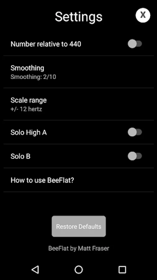 The settings are configurable including an adjustable scale range, the ability to have readings shown relative to concert pitch (450s) or their actual pitch (480s) and solo temperament options. The adjustable scale range allows you to dial in a level of sensitivity that is suitable to the level of the player you are tuning. BeeFlat is suitable for use by a top level Grade One band about to go on at The World's right through to a novice band at their first practice.