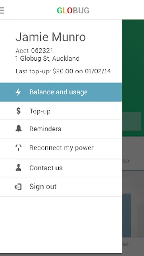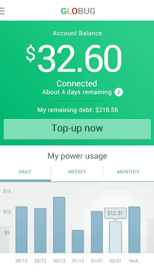 The GLOBUG app is a handy way to manage your GLOBUG prepay electricity account. The GLOBUG app allows you to view your account balance, Top-up your account with your Debit/Credit card or Internet Banking, see an estimate of how many days of power are remaining and to see how much you are spending on power; by day, week or month.