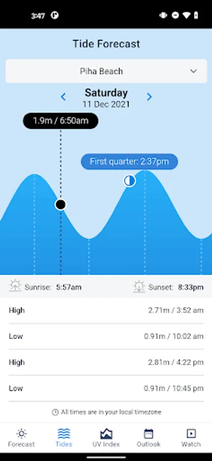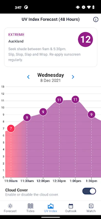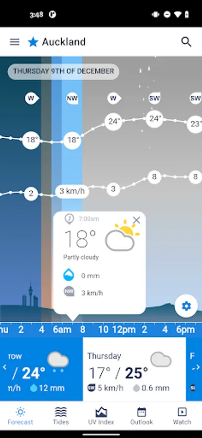 * Hour-to-hour temperature, humidity, rain, wind, cloud cover and UV forecasts