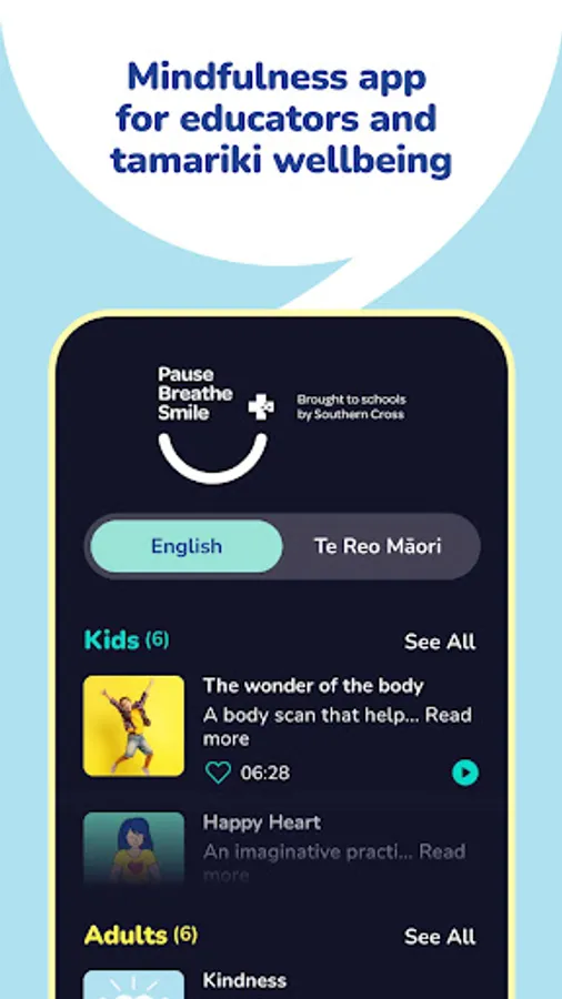 The Pause Breathe Smile app is primarily for educators who have trained in Aotearoa New Zealand’s own locally designed schools’ mindfulness-based programme; Pause Breathe Smile. The app is designed to support educator’s delivery of the programme’s lessons to tamariki in the classroom. This content is behind the login screen and access is provided to participants of our training only. The Pause Breathe Smile professional development training is proudly funded for New Zealand Primary and Intermediate schools by Southern Cross.