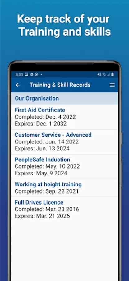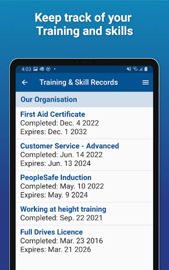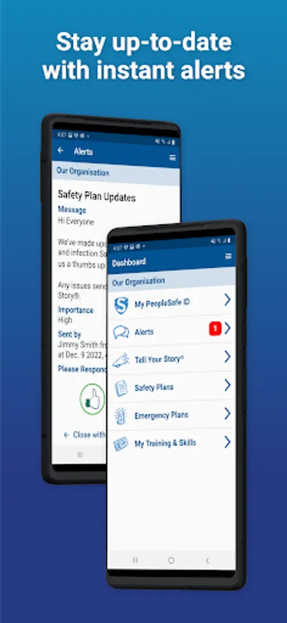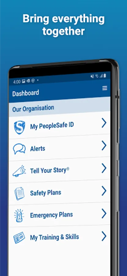 By having the PeopleSafe® StoryAnywhere mobile app in your pocket, you can easily access your organisation's Safety Plans and Emergency Plans, get safety Alerts and view your Training and Skill records. You can also update your contact details, including emergency contact info.