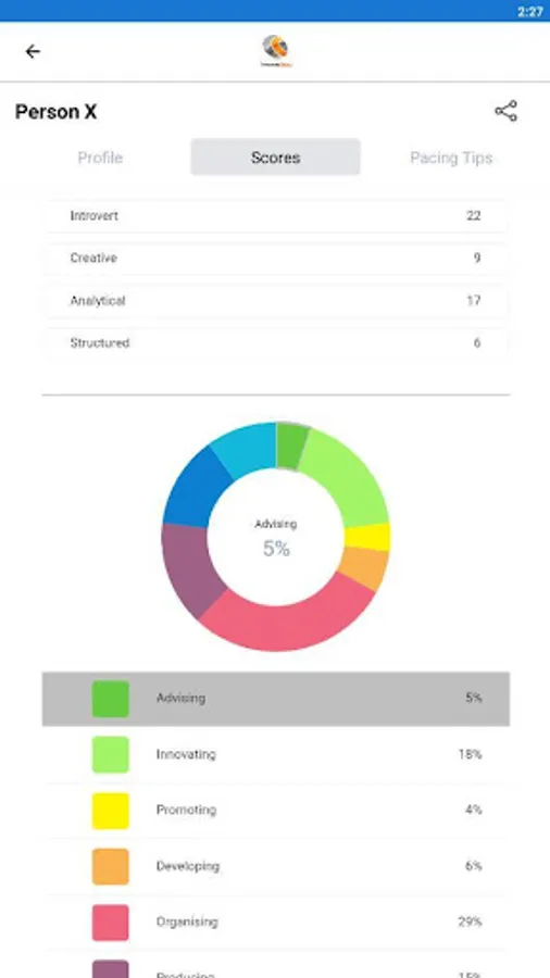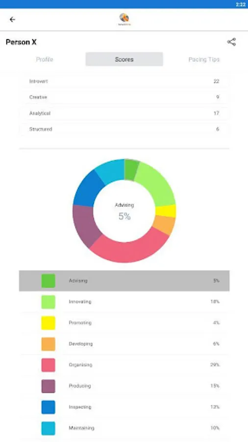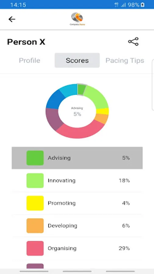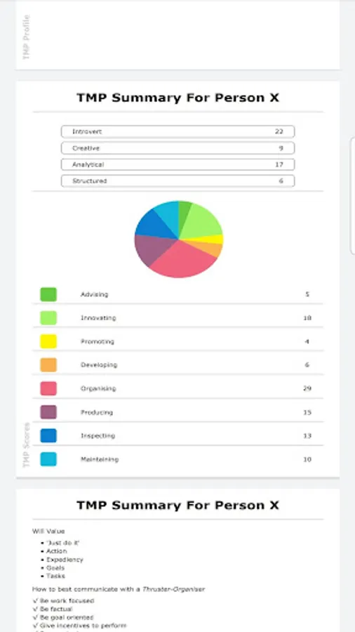 The App includes self-scores and percentages with scores and percentages of participating fellow team members. This includes advice on how best to adapt to the work style of that fellow team member.
