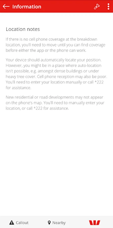 Once setup, use the app anytime to request a callout. Simply advise what help you need and the app will automatically locate you using your phone's GPS. There are also quick links to help you locate nearby services, turn on the flashlight and access our website.