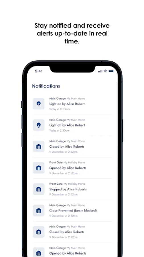 • Receive alerts when someone uses your garage door, when the door/s have been open for an extended period, or if your opener is due for a service