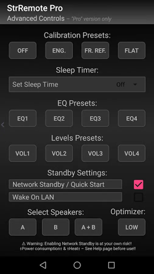 Calibration presets, Sleep Timer, speaker selection and Sound Optimizer.