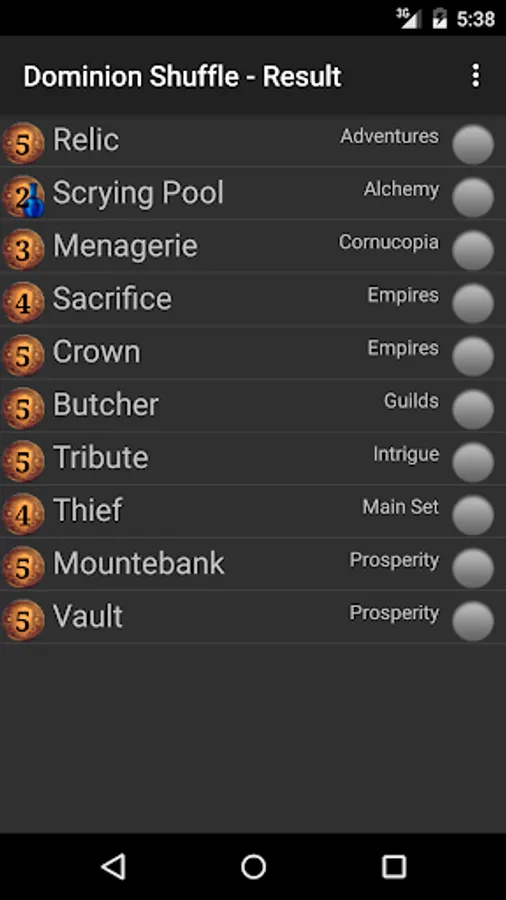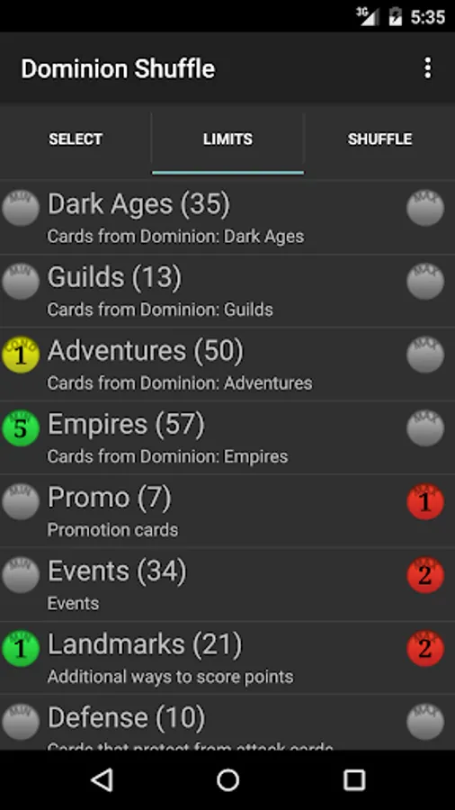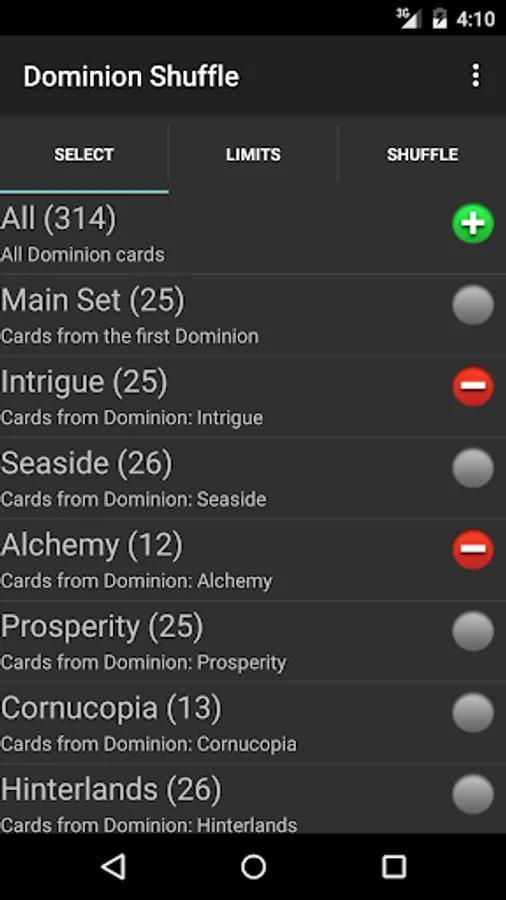 Despite the many other Dominion Shuffling Apps out there, I chose to update this one because I like the ability to select limits and optional conditions. I also happen to prefer the interface over the other Apps.