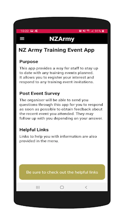 As well as providing useful information to ResF about any upcoming events, the app provides a trusted communication channel for official information that can be used by NZ Army staff, where they have access to the latest relevant and reliable information through the use of helpful links. This app is run as a limited proof-of-value exercise.