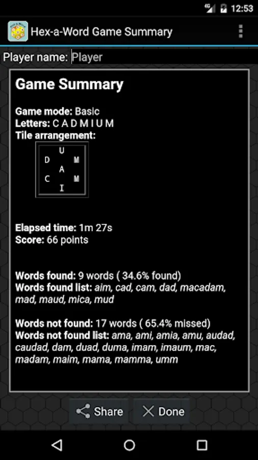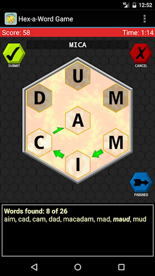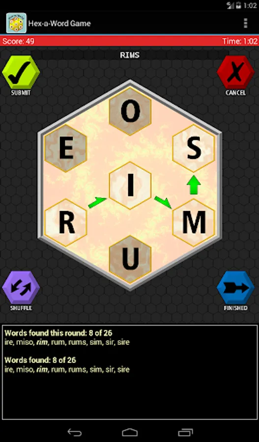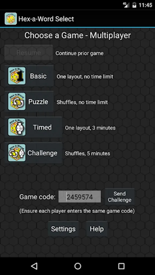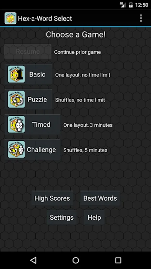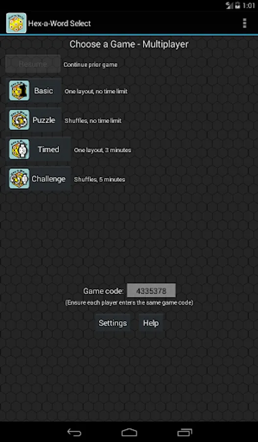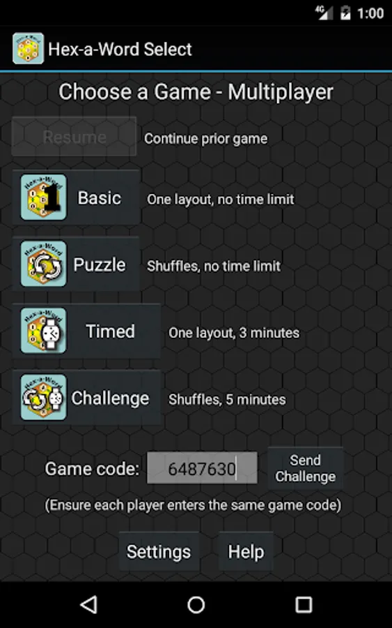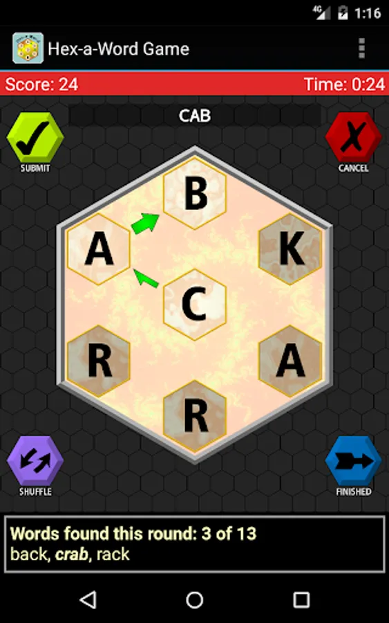Hex-a-Word includes both timed and free-play game modes, for both single and multiple players.