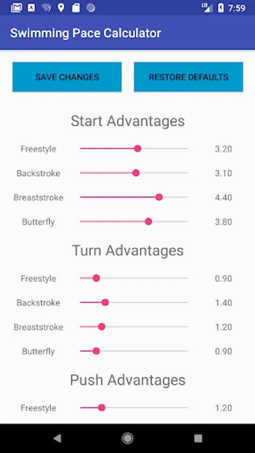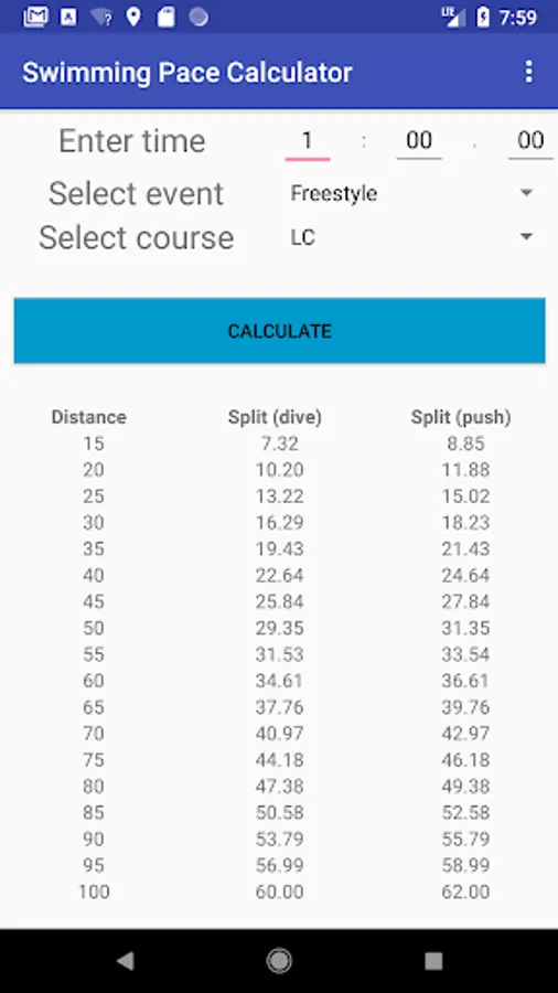 The app allows the underlying calculation to be calibrated by the user to account for swimmers that may have better or worse starts/turns or approach the pacing of races differently. The default values have been compared against race analysis of top international swimmers and align closely with their times (every swimmer is different though).