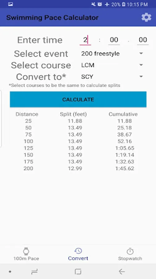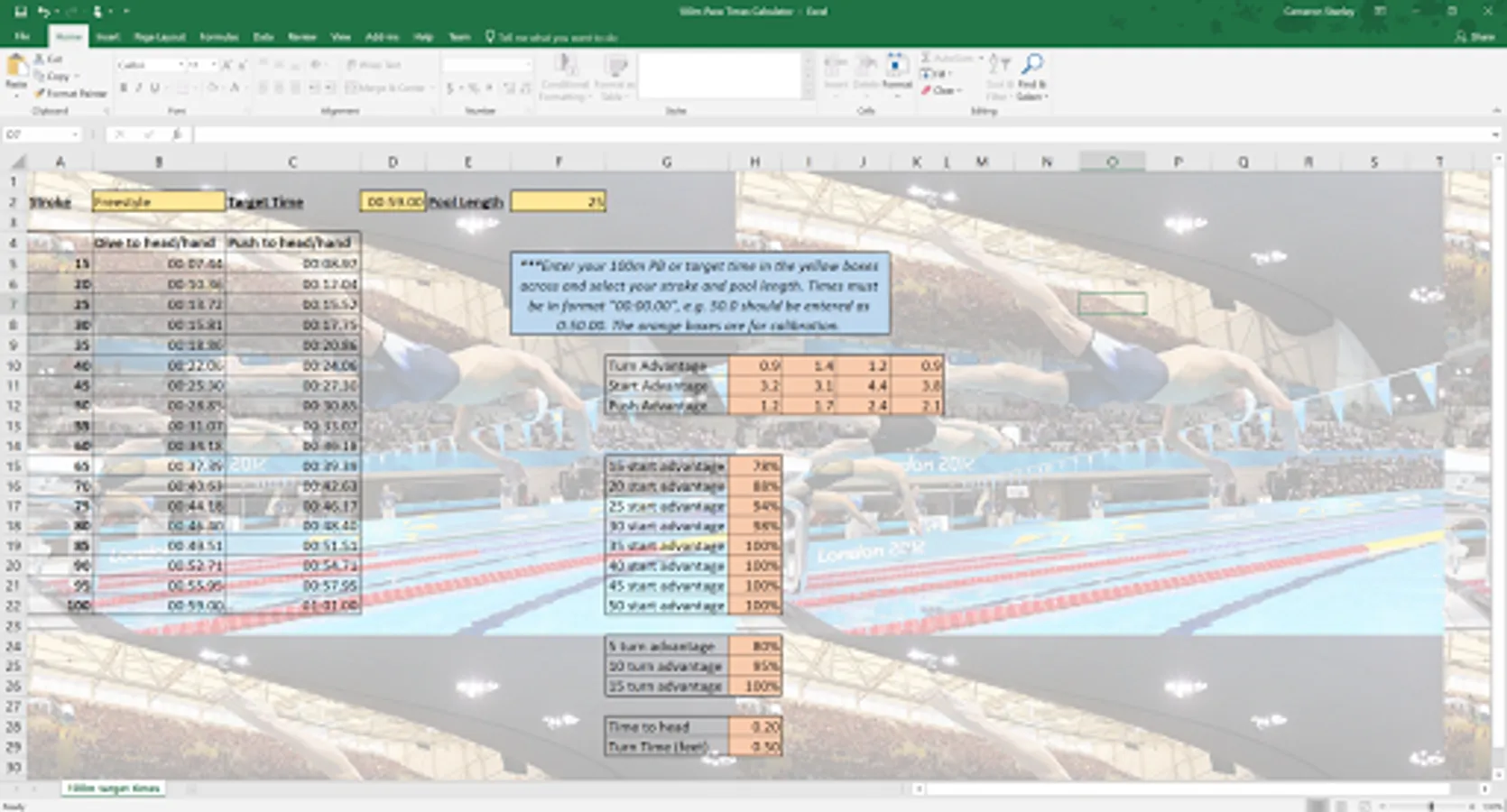 Uses a mathematical formula that takes into account start advantages, turn advantages, push advantages and time to the head/feet to convert between pool lengths, calculate splits and calculate target times for all distances between 15m and 100m, based off a swimmer's best time.