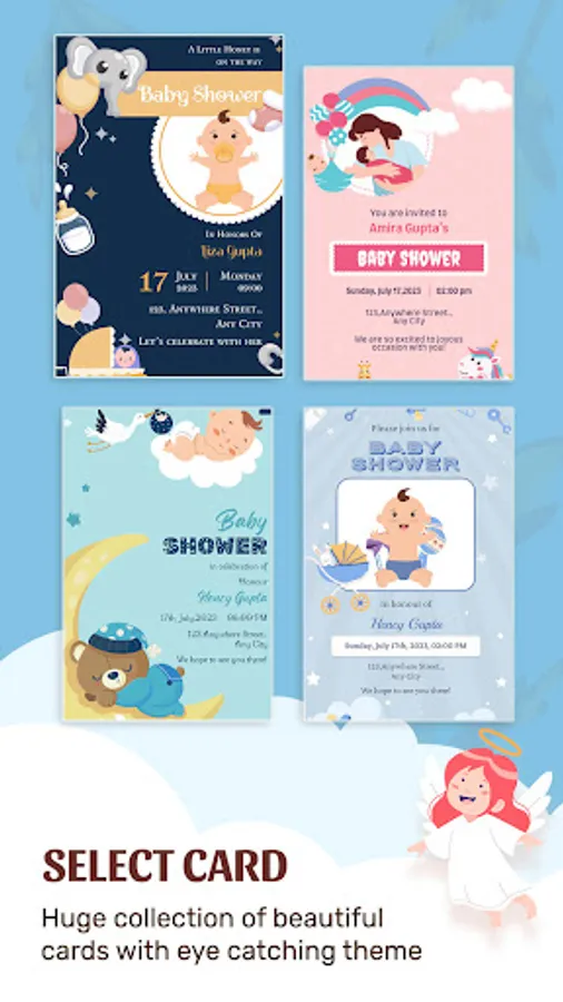 Make beautiful and eye catching invitation card with different Baby Shower card template to invite guests on your Baby Shower party with the help of Baby Shower Invitation Card Maker App.