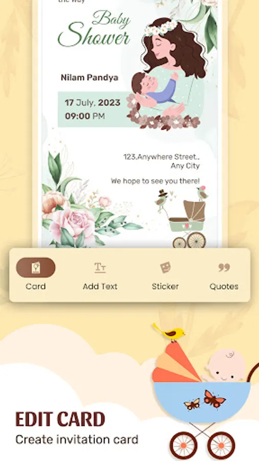 Using your mobile you can create beautiful invitation card with beautiful theme of Baby Shower card template and write name on card of your guests with colorful text and font.Design and send invitation with Baby Shower Invitation Card Maker.