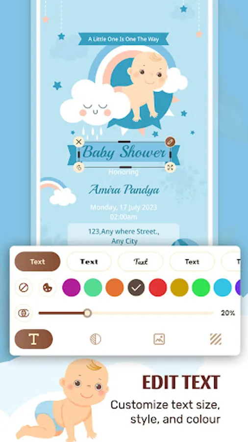 Baby Shower Invitation Card Maker allows you to design and share your own invitations for all type of Baby Shower functions. Make your own perfect Baby Shower invitations card using Baby Shower Invitation Card Maker.