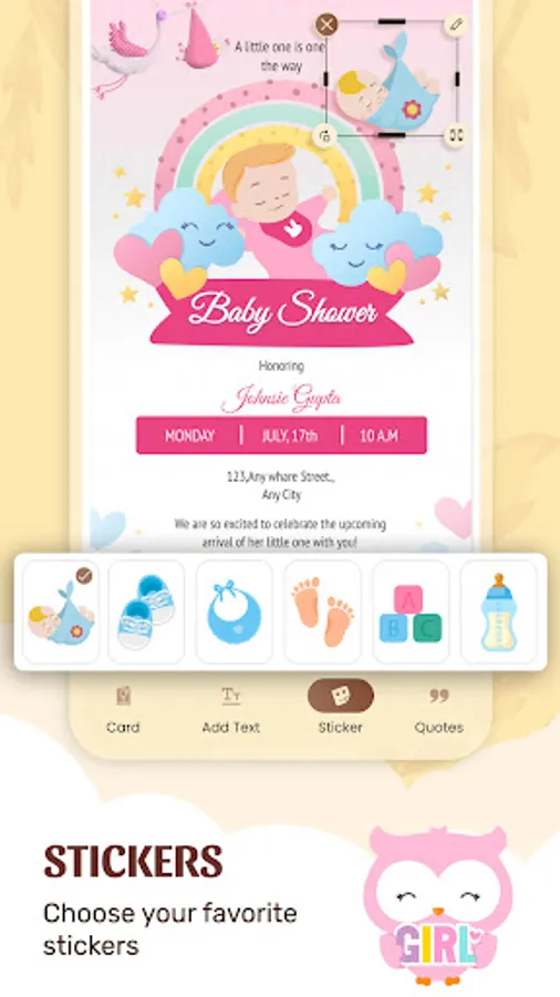 In Baby Shower Invitation Card Maker beautiful Collection of Cards , stickers , messages , text fonts and color to make Baby Shower Card more stylish . You can edit card ,quotes text , name easily.