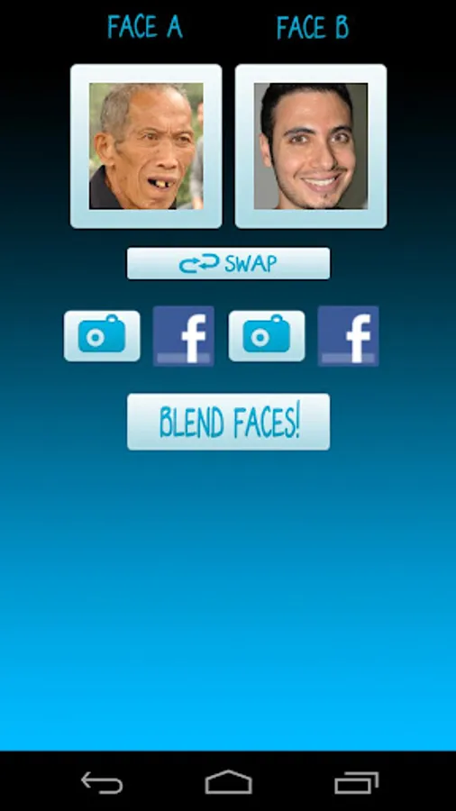 Use your camera to take two pictures of different faces or pick images from your photo gallery. Press the "Blend" button to blend them together! The result is a funny mixture of both faces.